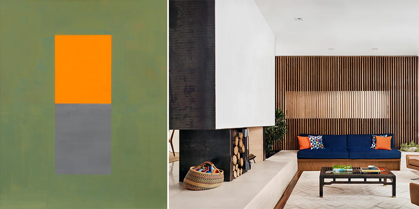 Nature is inherently calming, and artworks can help to embellish and emphasize natural elements in the living space—whether wood or stone, flowers or water. Here, it’s easy to picture how this color field by Erben complements this unique, ultramodern country home in Austin, which abounds with plant life, organic wooden paneling and accents, and earth tones.
