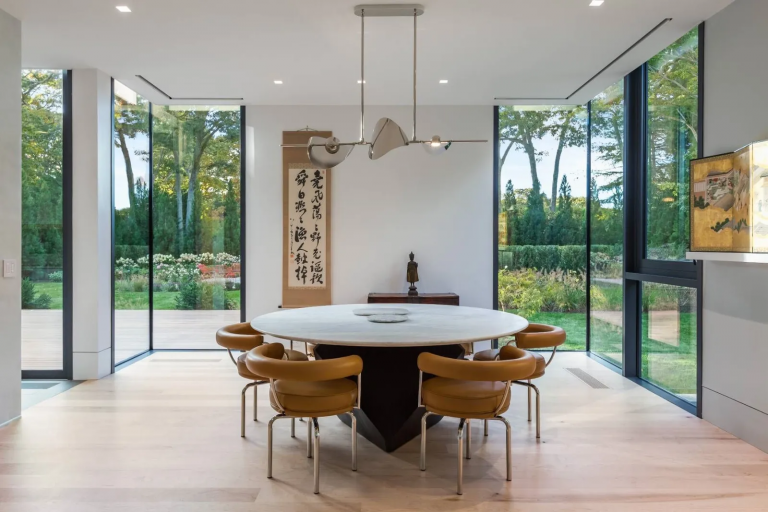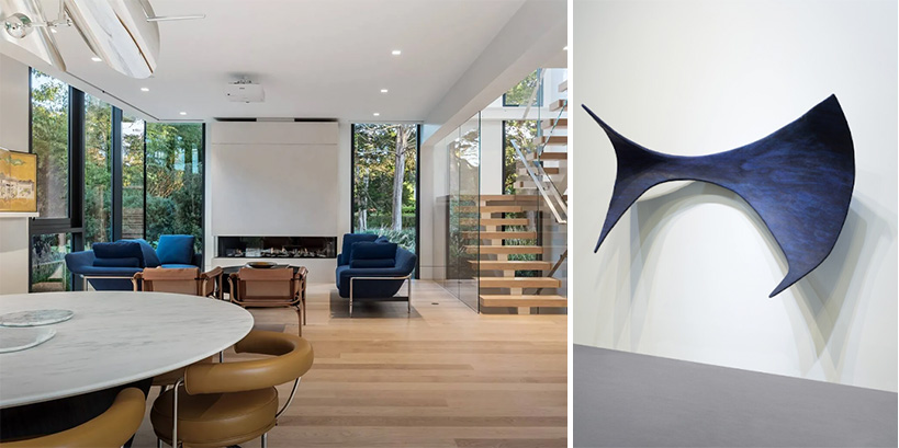 Not all artworks lie flush against a wall. When a work plays with light, depth, and dimension in novel ways, juxtapose it with a space that likewise combines different lines, curves, and contours in different ways. That’s why a piece like this evocative Lerner would be well-situated in the open-concept family room of this stunning East Hampton estate.