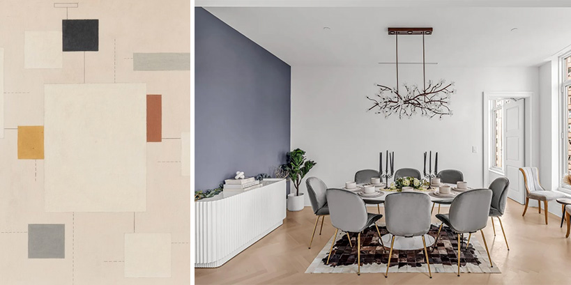 Sometimes, the best counterpoints to a work of art exist beyond the home itself. It’s not just the warm wooden interiors of this chic Brooklyn condo that enliven this jubilant Albers canvas, but the abundant sunlight and the historic brick and brownstone buildings across the bay.
