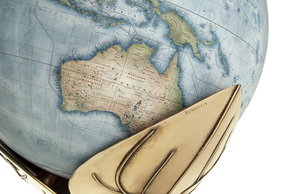 Personalization requests include labeling places close to a client’s heart, tracking family migration, or showing someone’s favorite travel itineraries. One of the more unusual commissions, Bellerby says, was a globe depicting undersea cables, reflecting that particular client’s industry. It sits on a base of three bronze petals, engraved with the names of his daughters and housing the ball bearings on which the globe spins.