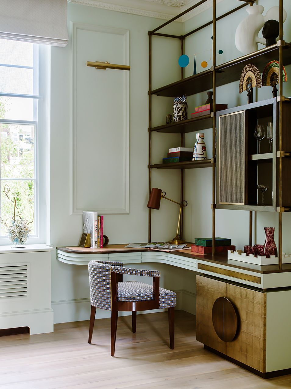 In another London home designed by Elicyon, the printer is tucked away in a cupboard with a bar concealed in the elegant art deco-inspired modular unit above. This study is just off the primary living room so doubles as a “spillover” space, explains Gandhi. The client enjoys playing card and board games, so a bespoke table used for meetings has built-in games storage, too.