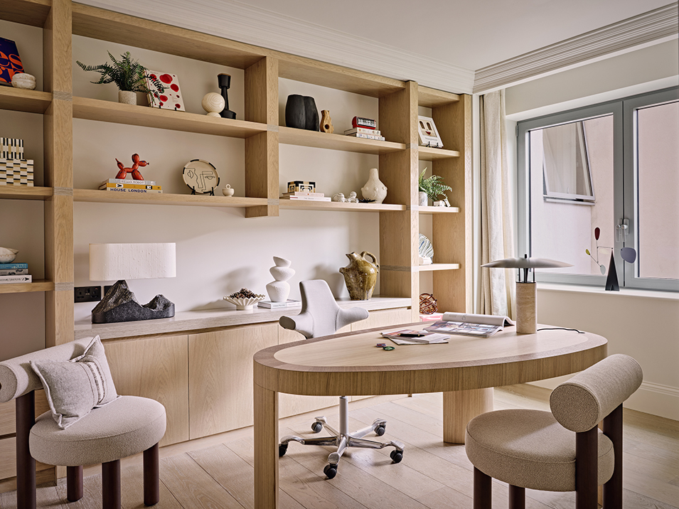 Acoustics are a key consideration. In a Westminster penthouse, London-based interior design studio Elicyon used a special plaster on the study ceiling that can absorb unwanted sound and lined the sides of shelves with sound-proofing fabric. “That client was self aware enough to say, ‘Look, apparently I’m quite shouty on phone calls and it gets to the family,’” says Charu Gandhi, founder and director of Elicyon.