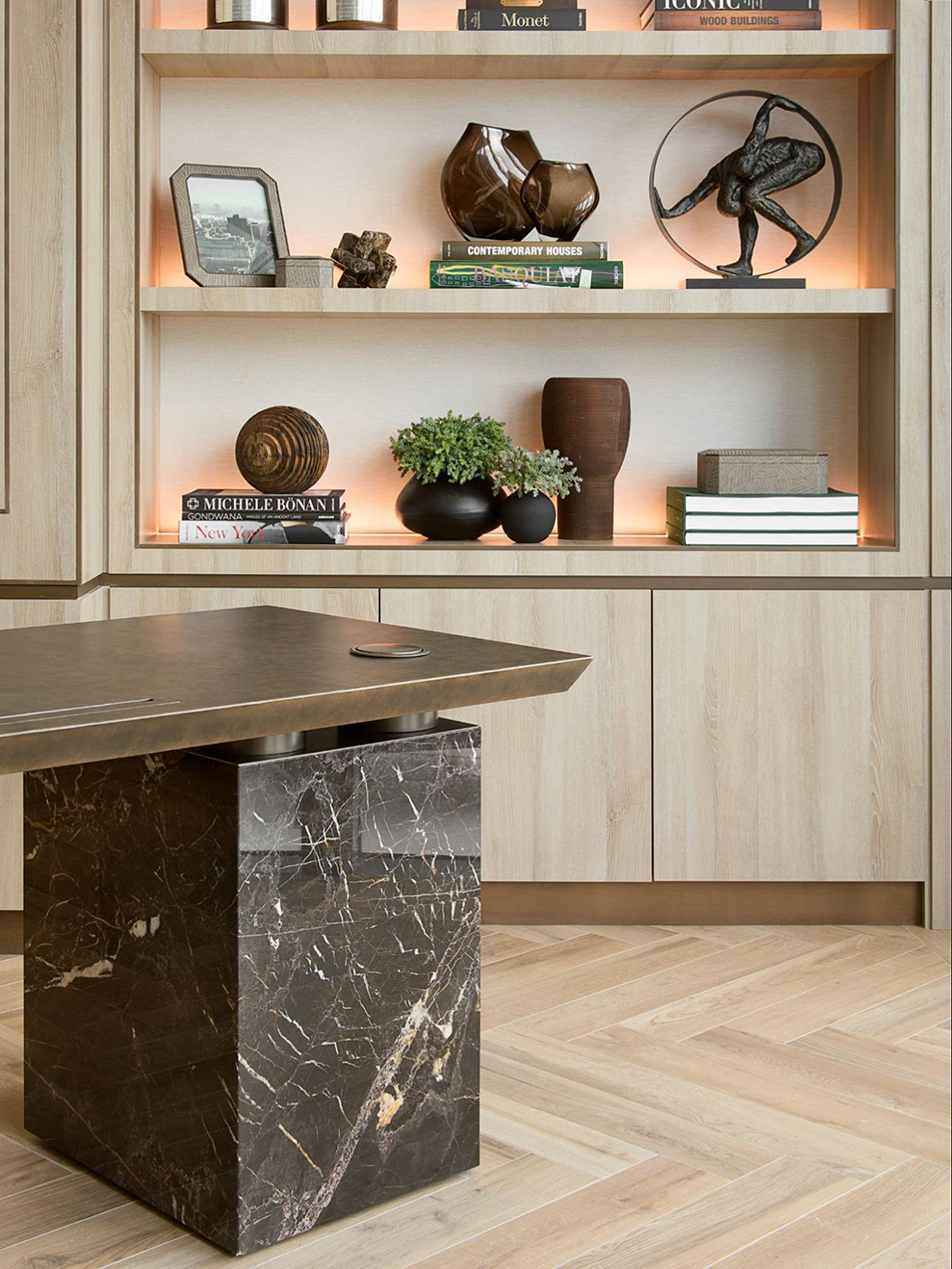 She brought “a masculine feel” to the daylight-filled room with the use of materials including fluted mid-tone timber, sandy-colored leather and a bespoke dog-leg desk with a Nero Marquina marble base and liquid metal-finish top.