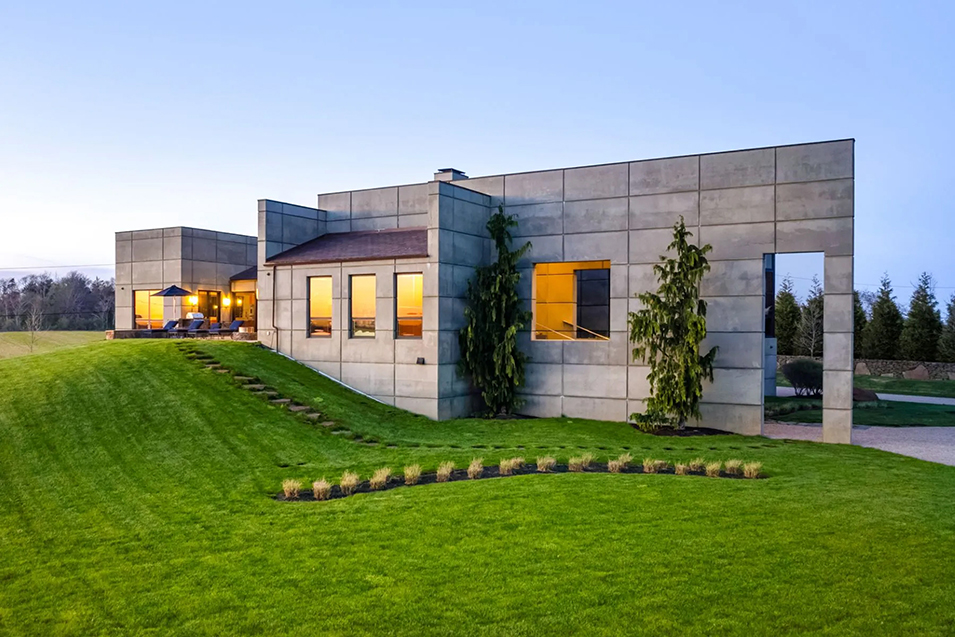 In stark contrast, the 2016 Rhode Island residence, Brutaliste Sur Mer, is designed to be seen from afar. Like a Rubik’s cube of interlocking concrete planes, this outwardly striking home— a committed example of coastal brutalism—is warmed up internally with teak wall cladding and bespoke features such as a timber-lined dressing room and six-seater home theater. It also has unparalleled vistas of the Sakonnet Passage thanks to its high elevation.