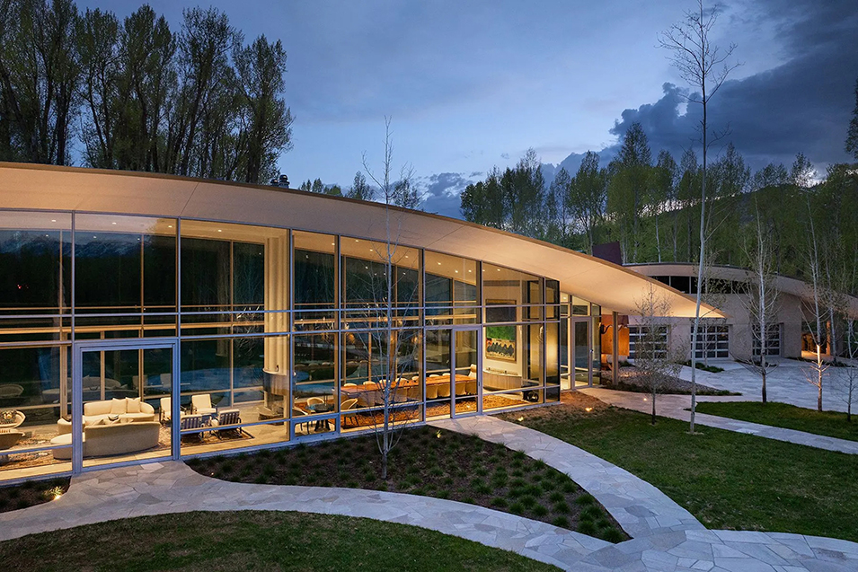 In Wyoming, The River House by architect Wallace Cunningham is nestled low among a landscape of river and creeks. From the outside, the building—completed in 2023— appears like a public art gallery, with a shallow arched roof and floor-to-ceiling glazed walls. Inside, stone fireplaces and timber joinery add comfort amid abundant natural light and views into the surrounding nature.