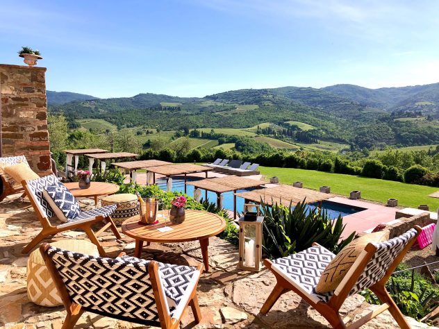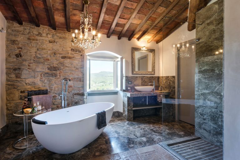 Gentle renovations through the years have preserved the historic features of the property, highlighting exposed brick walls, broad ceiling beams, and stone window frames. It’s a dramatic atmosphere that supports bold interior design, including large chandeliers and restored renaissance frescoes—and modern fixtures, such as the industrial kitchen and outdoor pool area, make 21st-century living here effortless.