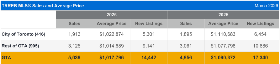 March brought a modest shift in tone to the Greater Toronto Area (GTA) housing market. After a slow start to the year, the spring market began to show more life, with sales improving both month over month and slightly year over year. According to the Toronto Regional Real Estate Board (TRREB), GTA home sales reached 5,039 in March, up 1.7% compared to March 2025, while the average selling price came in at $1,017,796, down 6.7% from a year ago. The MLS Home Price Index benchmark was also down 7.4% annually, reinforcing that while activity has strengthened, pricing remains softer than it was last spring.
