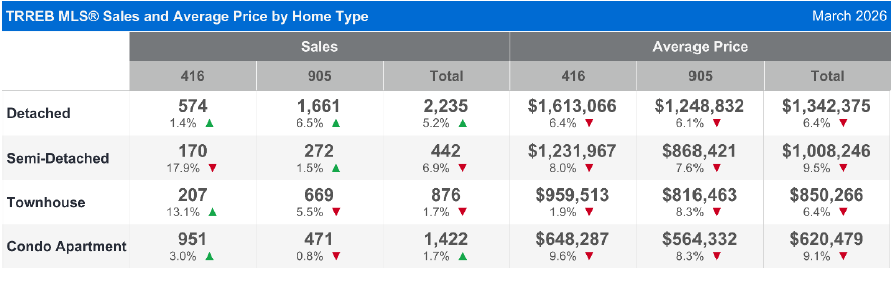 Across property types, the market remains uneven. Detached homes continued to show relative resilience in March, with average prices rising modestly from February and sales volumes improving. Freehold townhomes also appeared comparatively stable. By contrast, semis and condominium apartments remained under greater pressure, with condo values showing some of the steepest year-over-year declines. Condo apartments averaged $620,479 across the GTA, down roughly 9% from March 2025, despite a rebound in sales activity. This suggests that demand is returning selectively, but only where pricing reflects current market realities.