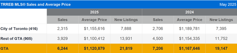 Confidence continues to lag in this spring market while inventory surges, creating opportunity for buyers. May’s real estate results for the Greater Toronto Area (GTA) reveal a market still defined by hesitancy, despite growing affordability and two straight months of sales growth. According to the latest data from the Toronto Regional Real Estate Board (TRREB), 6,244 homes traded hands last month, representing an 11.7% increase over April but still 13.3% below May 2024’s sales volume. While some seasonal momentum is evident, many buyers remain on the sidelines amid macroeconomic uncertainty and evolving global trade dynamics. Ignoring May of 2020, which was affected by the pandemic, last month’s sales are the lowest in any month of May in all time.