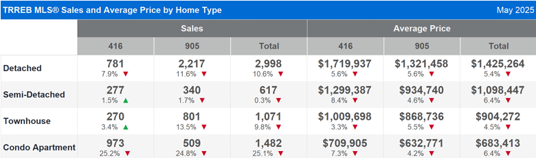 In the City of Toronto, year-over-year average sale prices for detached homes were $1,719,937, down 5.6%, semi-detached homes were $1,299,287, down 8.4%, townhomes were $1,009,698, down 3.3%, and condo apartments were $709,905, down 7.3%.