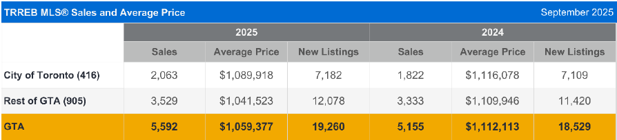 In the City of Toronto, the average price was slightly higher at $1,089,918, representing a more modest 2.1% annual decline but a notable 9.9% increase from August.  A strong signal that the downtown market may be stabilizing sooner than the surrounding regions. Detached homes in the GTA averaged $1,359,030, semis $1,015,543, and condos $655,231, each down between 4% and 7% from last year.
