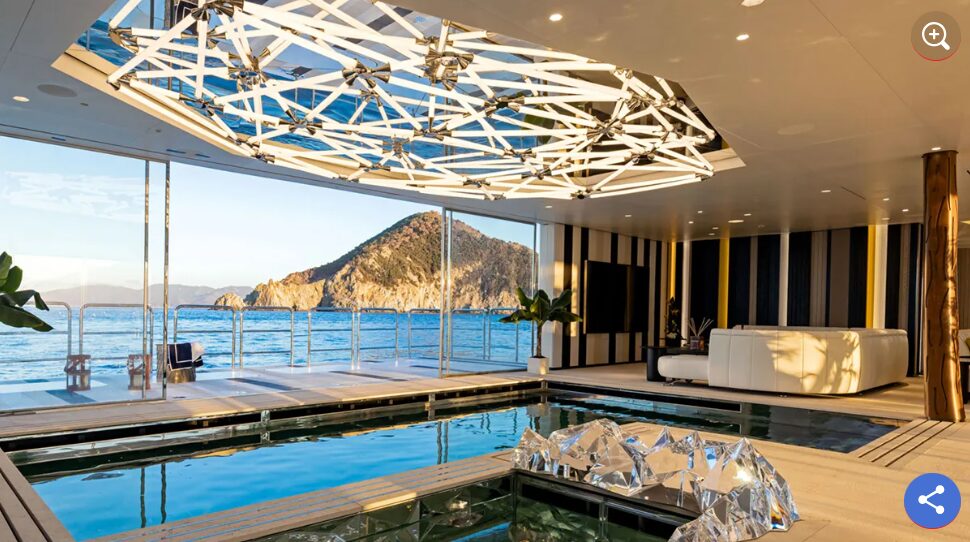 The seven standouts included on this list demonstrate the versatility of the aft space and the differing approaches to aesthetics. The beach club on Bilgin’s Leona, for example, pays homage to Ancient Greece with frescoed walls, marble floors, and sculptures of mythological figures. At the other, more modern end of the spectrum, the beach club on Benetti’s Luminosity evokes an art gallery with sculptural lights and an ultra-reflective, stainless-steel swimming pool. The one thing that unites all seven is a sense of luxury.