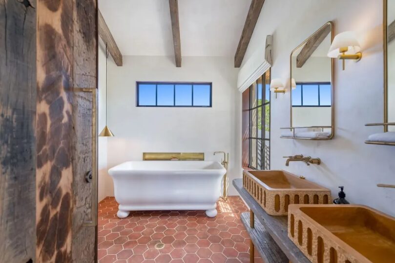 Lo Scoglio, perched on a crest in Coopers Shoot near Byron Bay, Australia, exemplifies this approach. Conceived as a contemporary reinterpretation of a Sicilian masseria (rural estate), the main villa and guest house are united in their sensitive use of craft—from hand-chipped limestone walls, century-old hardwood floor and terracotta finishes to brass details sourced through Tigmi Trading. In a contemporary take on crafted luxury, the estate blends these artisanal details with modern systems, including solar power and rainwater harvesting.